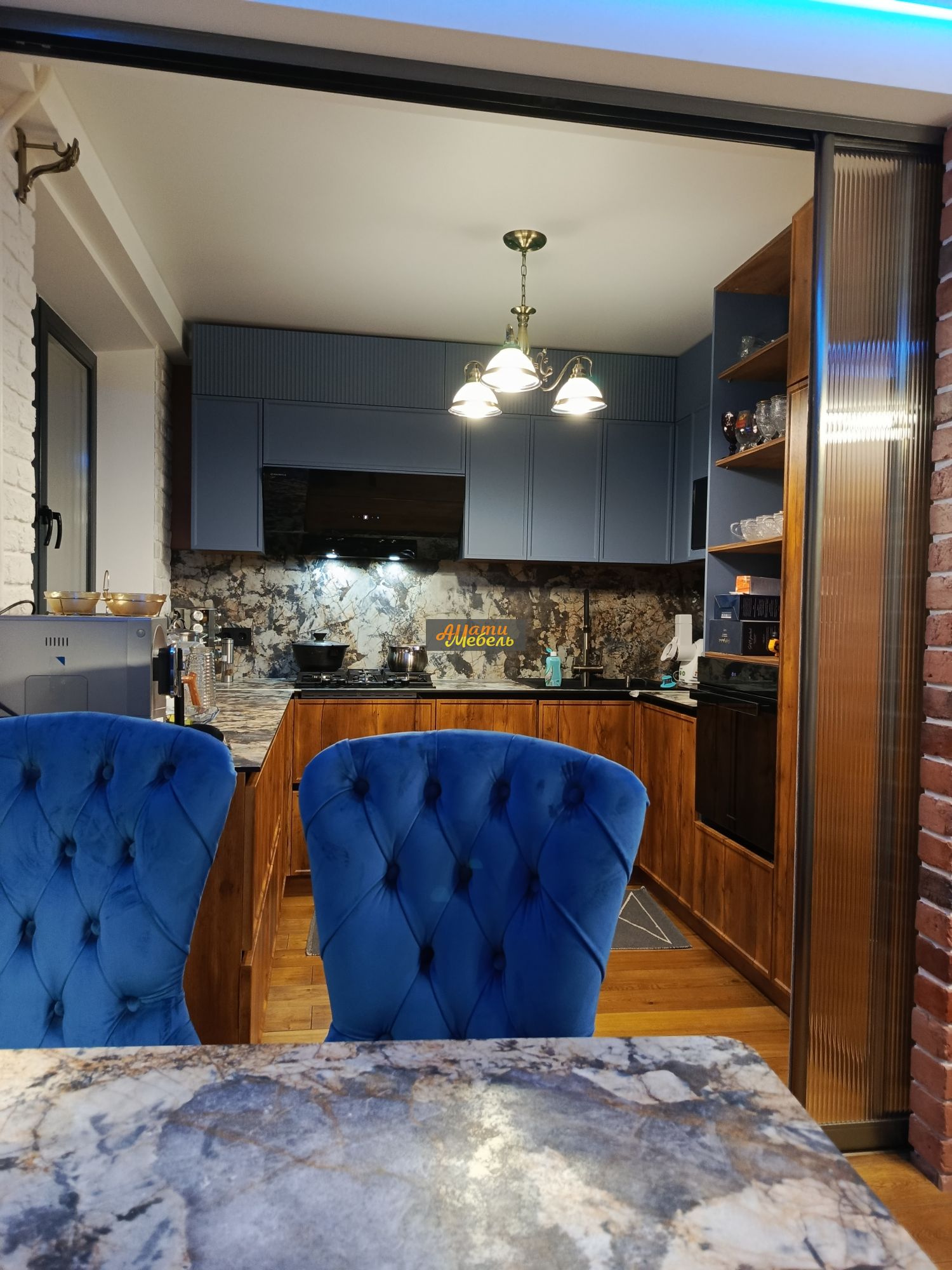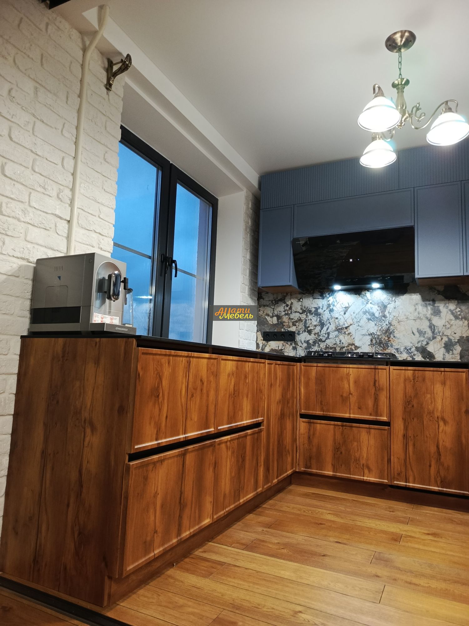 Гарнитур выполнен в популярном стиле лофт, который идеально подходит для современных интерьеров. Контрастное сочетание теплых древесных оттенков нижних шкафов и холодного серо-голубого цвета верхних модулей создает динамичный и стильный образ. Минималистичные формы, интегрированные ручки-прорези и отсутствие излишнего декора подчеркивают современную эстетику.