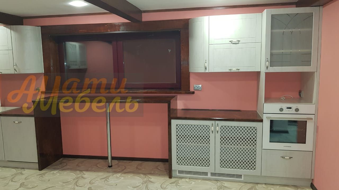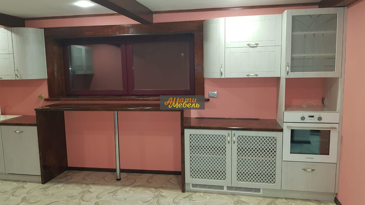 Тамбураты сделаны из столешницы слева и справа,барная стойка сделана под окно .Радиатор спрятан в шкаф.